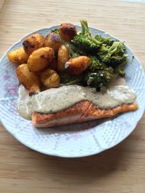 Het laatste top-reisgerechtje van "Amuses & Délices op reis" het leverde een welgemeende ‘amai da’s lekker’ op aan tafel. Dus deel ik dit heel graag met jullie. Een vers stukje zalm, krokant gebakken in de pan, met een bijhorende saus op basis van kruidenkaas.