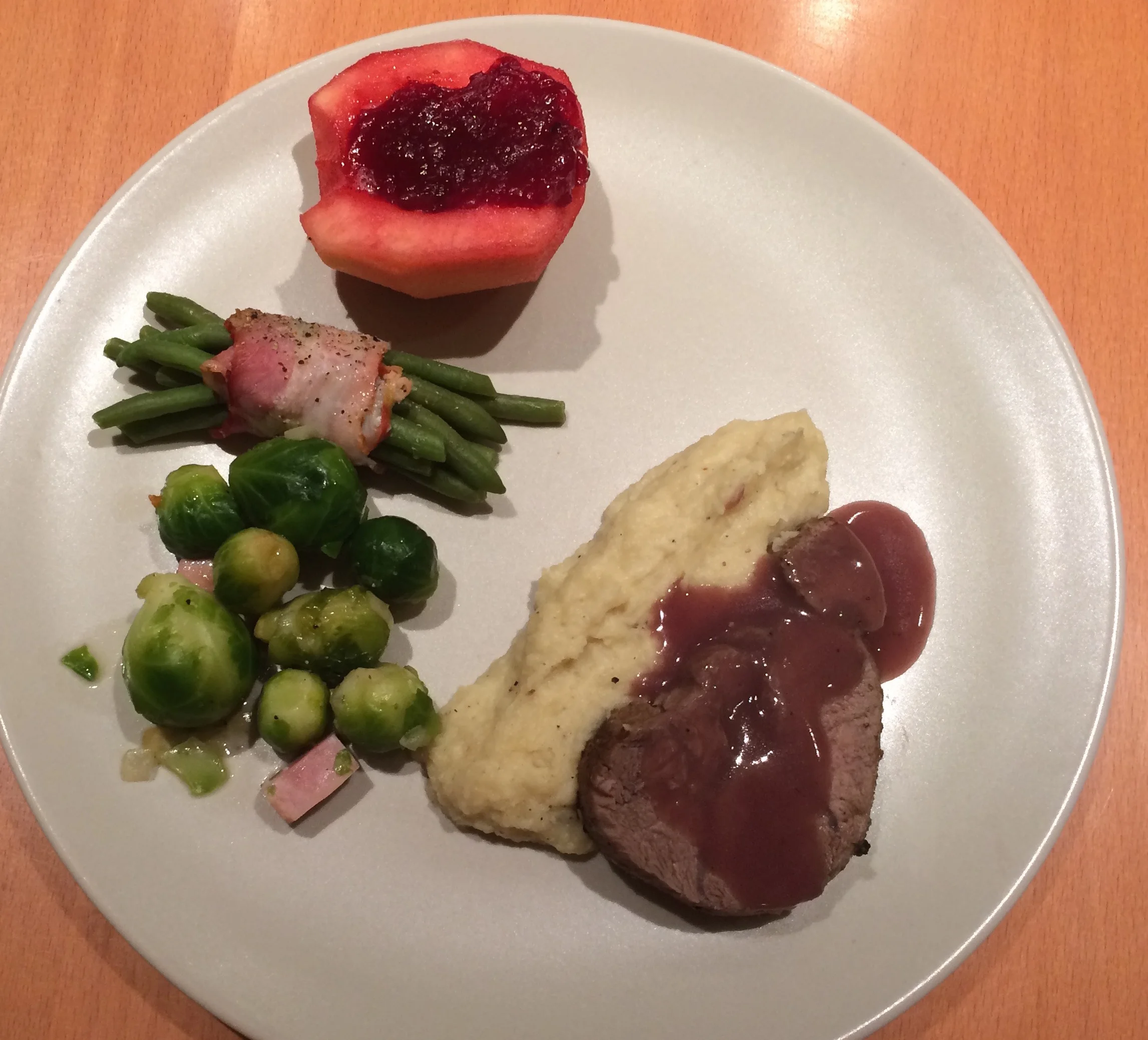 Serveer iedereen enkele schijfjes van het hertengebraad; serveer met de feestelijke wintergroentjes, een crème van pasinaak en appeltjes met veenbessen.
