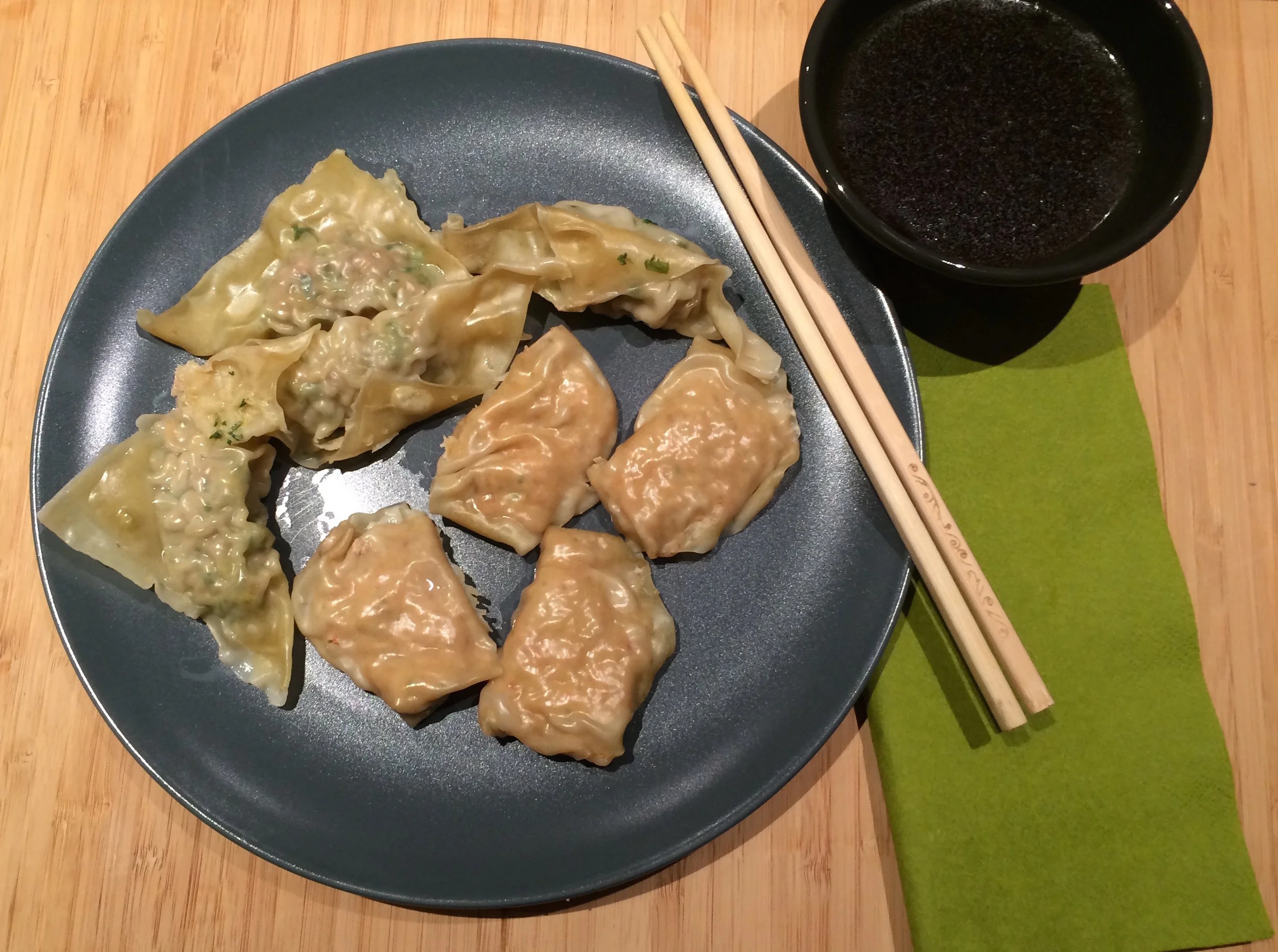 Giet de bouillon door een fijne zeef en serveer samen met de dim sums.