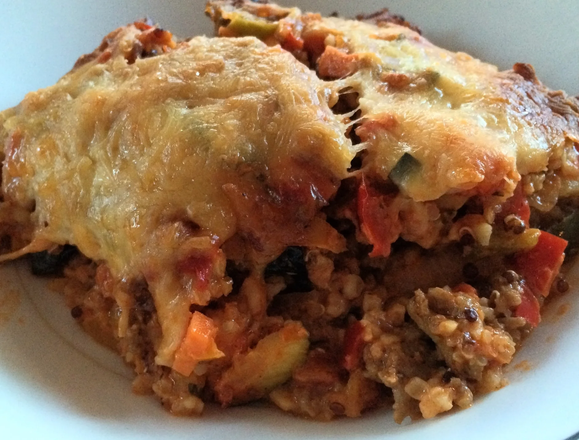 - Voeg in een ruime ovenschotel de quinoa, het kippengehakt en de beetgare groenten samen. Meng goed onder elkaar.