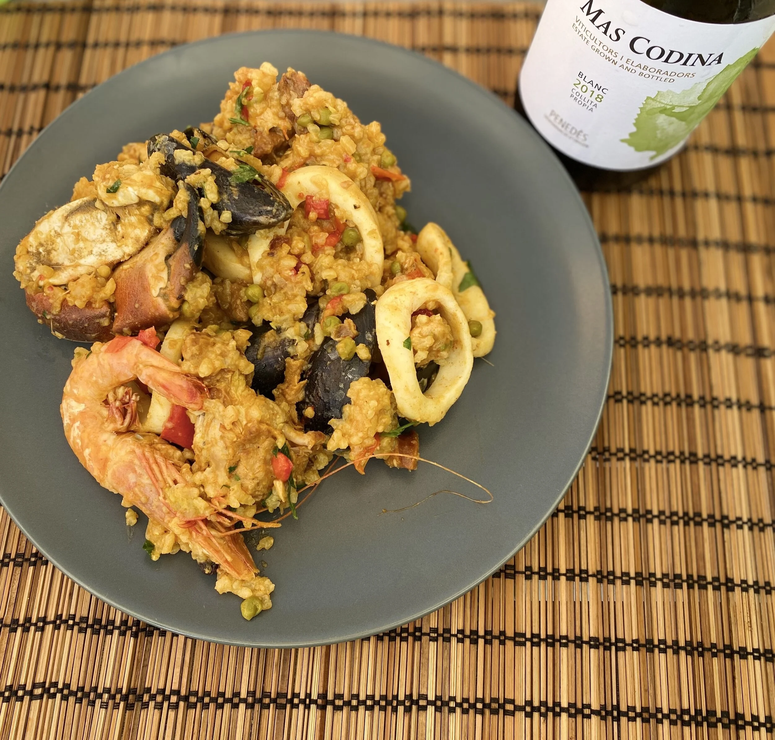 Paella bevat verschillende combinaties van groenten en vis of vlees. Over het algemeen wordt dit gerecht gekruid met saffraan. Het vlees, de vis en groenten die gebruikt worden zijn afhankelijk van de regio. Voor deze Amuses & Délicesversie kies ik voor kip, chorizo, scampi, grote gamba’s, mosselen, venusschelpen en inktvis)