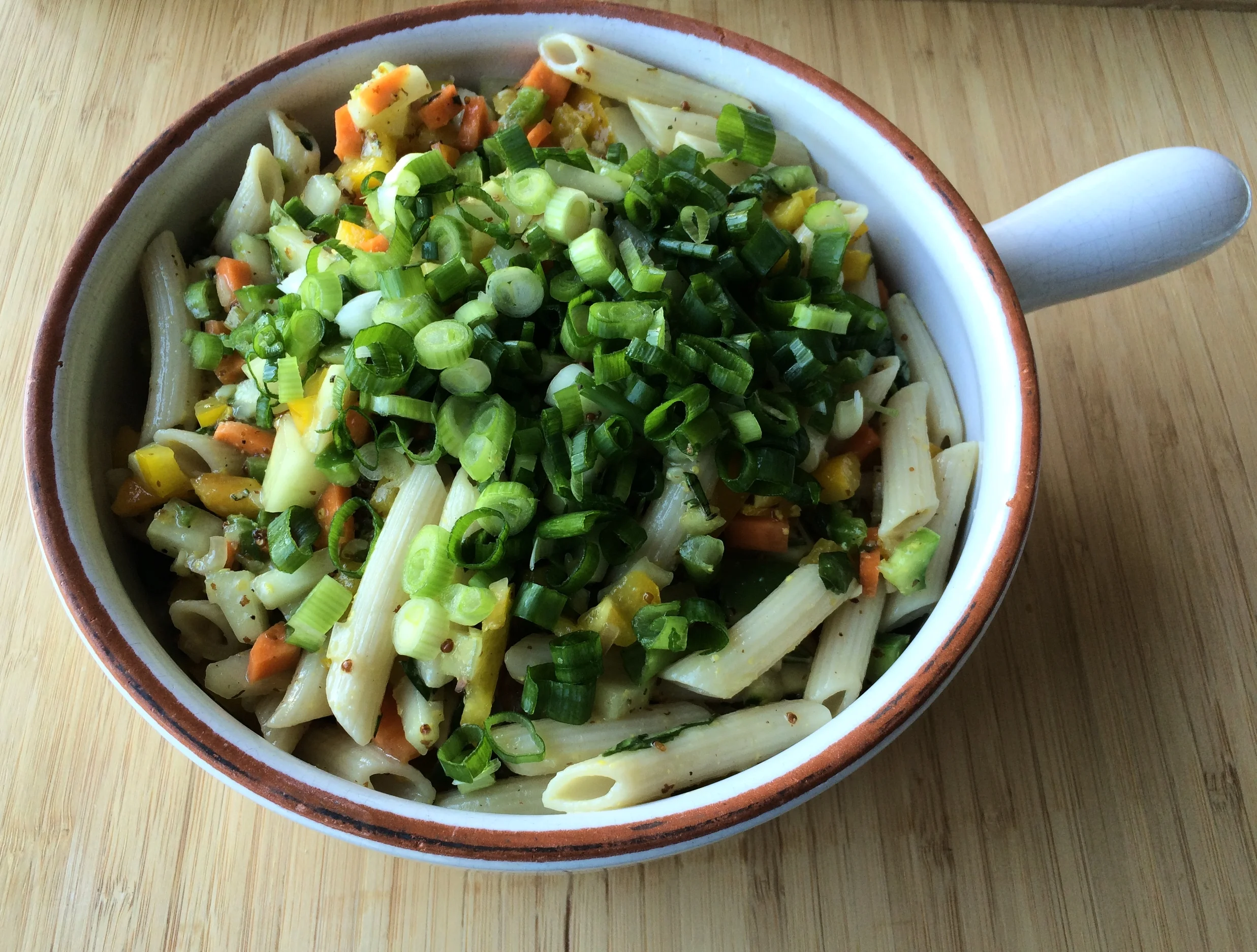 - Voeg de groentjes bij de afgekoelde pasta en werk af met een frisse vinaigrette en fijngesnipperde pijpajuintjes
