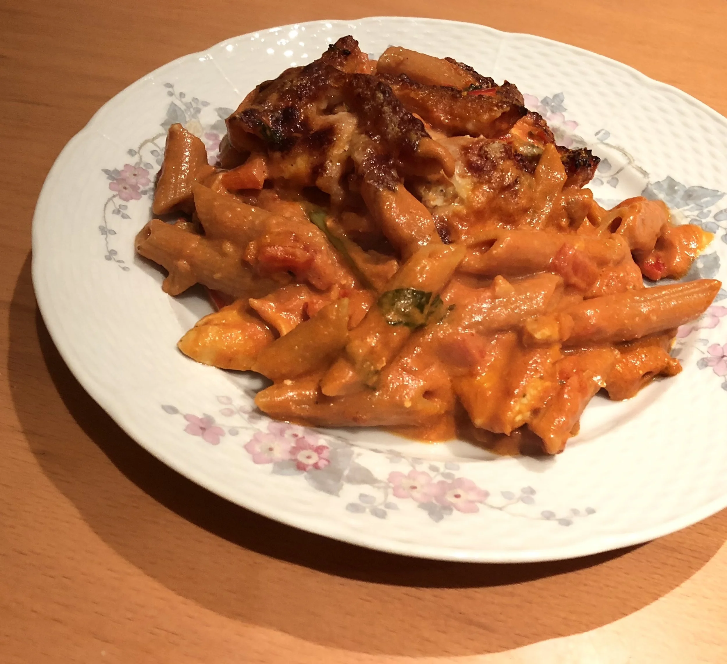 Giet de pasta in een vergiet af en doe hem bij de kip en tomatensaus. Meng goed om en schik alles in een een ruime ovenschaal.