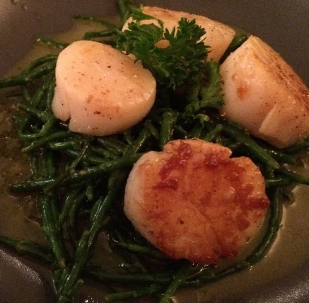 Serveer een beetje peterseliesoep in een diep bord; met hierin de zeekraal en schik hierop de sint-Jacobsvruchten.