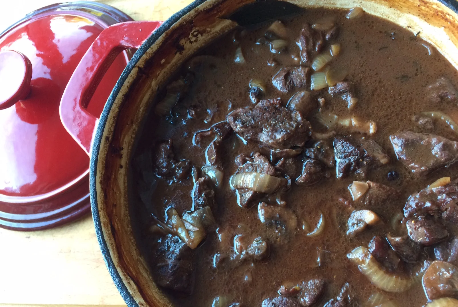 - Giet de warme wijn in de stoofpot met vlees en bepoeder de stoofschotel met wat bloem en roer.