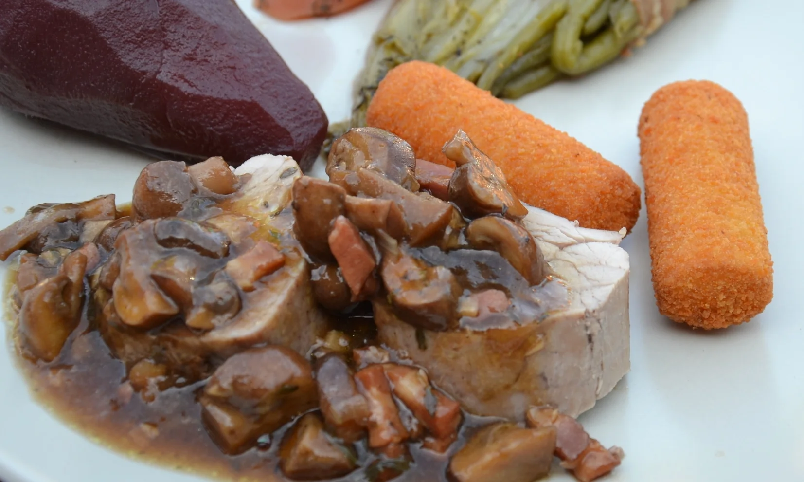 Varkenshaasje met jagersaus, heerlijk geserveerd met gestoofde groentjes(wortelen, witlof, boontjes), gestoofde peertjes en kroketjes