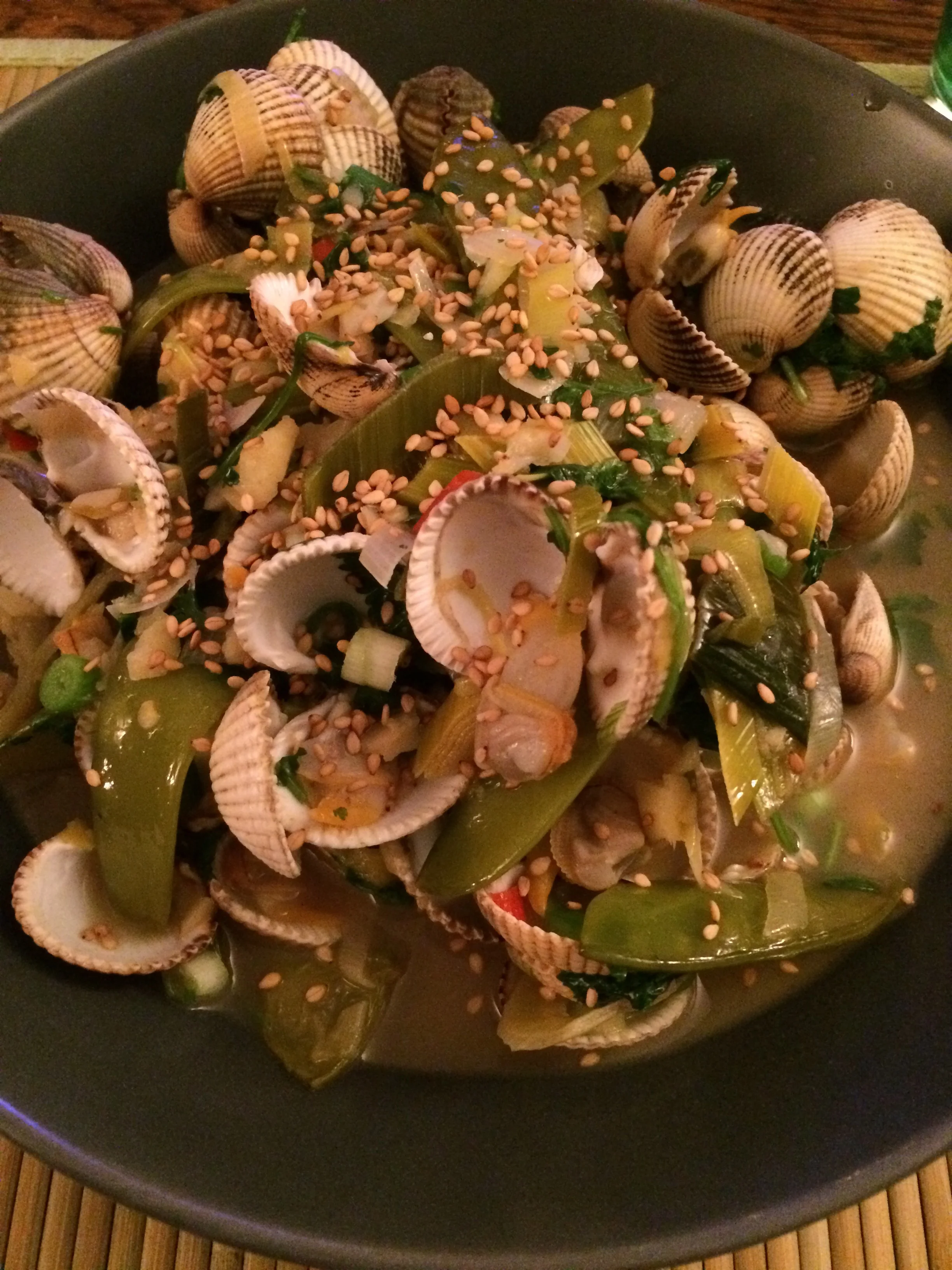 - Als de prei gaar is, voeg dan de wijn en sojasaus toe en leg er de kokkels bovenop.